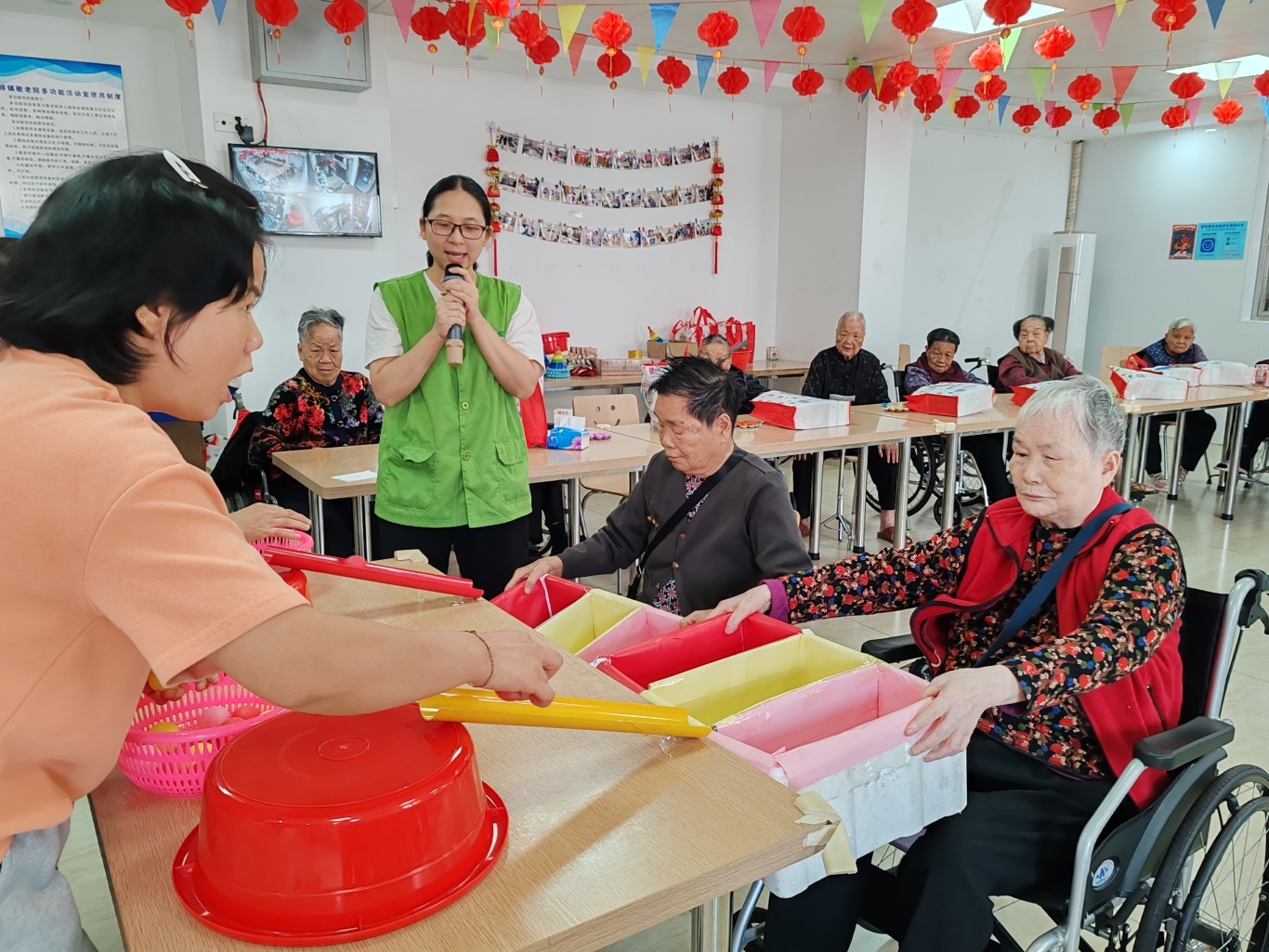 “彩盒接福球”游戏趣味十足。老人们手持彩色纸盒,专注接住对应颜色的乒乓球,在社工的带领下,大家积极参与,现场笑声不断,既锻炼了手眼协调能力,又收获了欢乐。