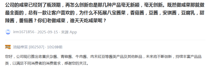 “你们老做咸菜,谁天天吃咸菜呢?”9月15日,就咸菜产品销量承压问题,一名投资者在互动平台向涪陵榨菜(002507)发出吐槽,公司的咸菜已经到了瓶颈期,再怎么创新也是那几种产品毫无创新,为什么不拓展八宝酱菜、香菇酱、豆酱等产品。