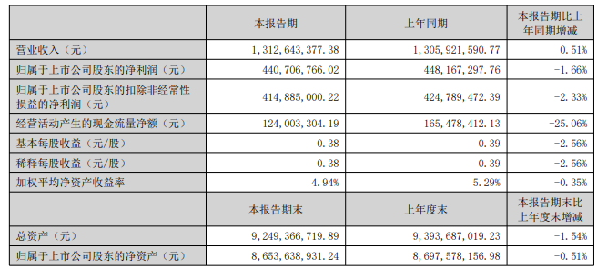 今年上半年,公司实现营业总收入13.13亿元,同比增长0.51%,归母净利润为4.41亿元,同比下降1.66%;扣非净利润为4.15亿元,同比下降2.33%。